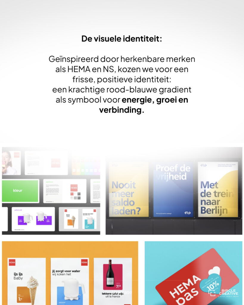 Een frisse, positieve identiteit met een herkenbare rood-blauwe gradient – symbool voor energie, groei en verbinding.